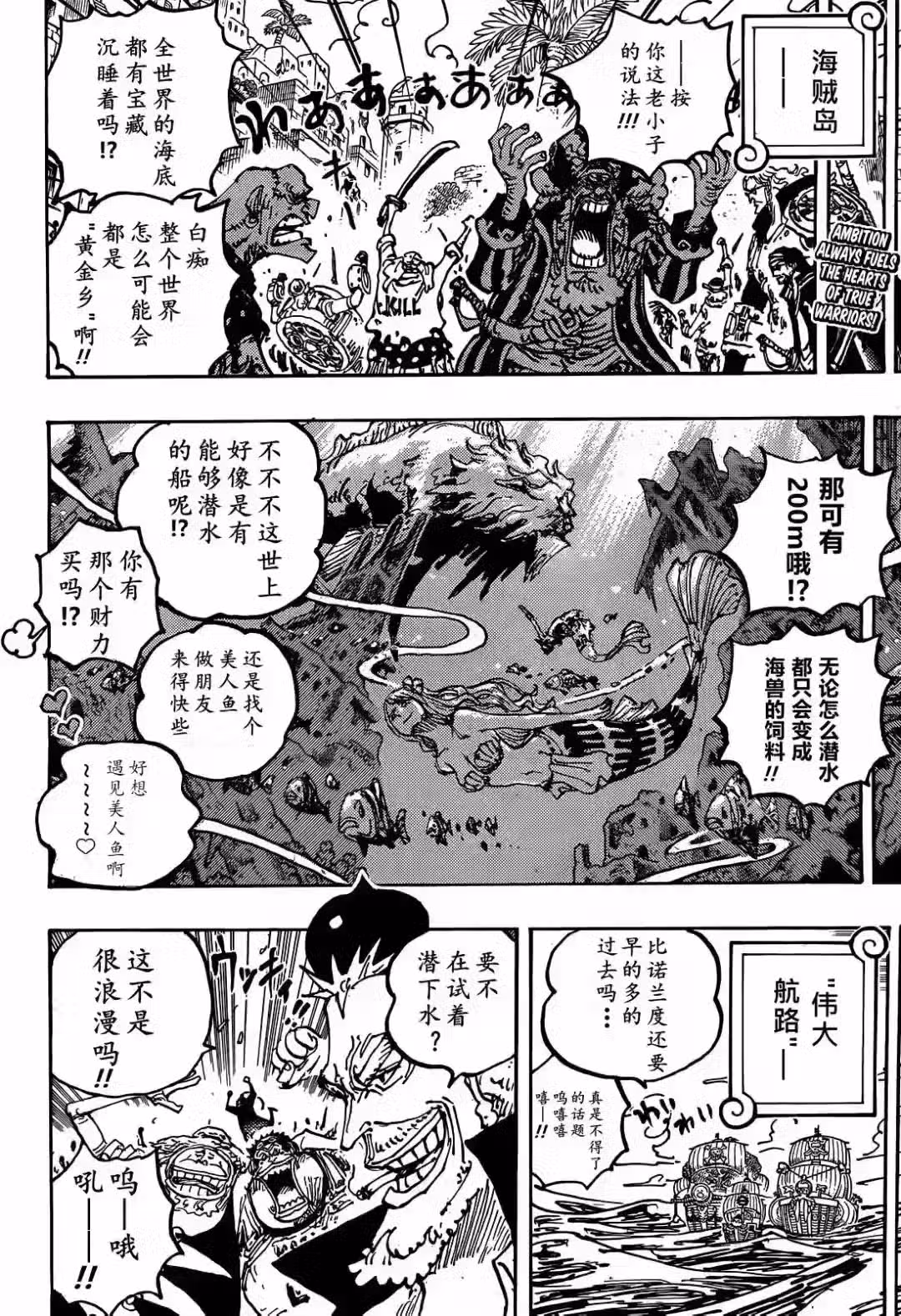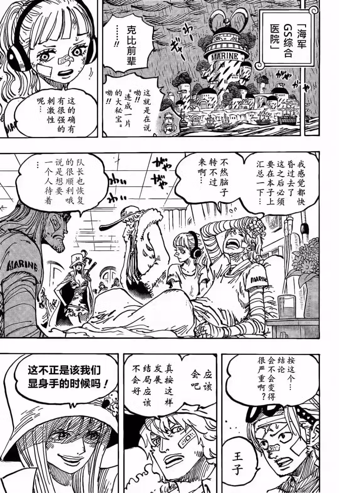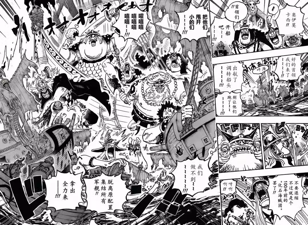 在蜂巢島上,一群海賊正在談論貝加龐克所說的事情,寶藏就在海底,他們想去海底尋寶。其中兩個老熟人出現,他就是傳說中的阿金,這傢伙時隔26年終於出現了,還有克里克等人,他們都加入了黑鬍子海賊團。在偉大航路,大猩猩和猴子仍在打撈船隻,在海軍醫院裡,特殊部隊成員已經回來,他們正在養傷,還討論貝加龐克所說的真相。