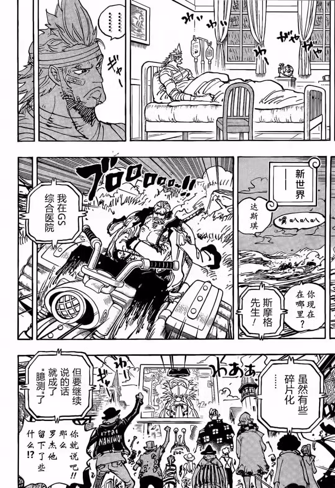 德雷克沒有戰死,他身負重傷回到海軍醫院,斯摩格也出現了,他跟達斯琪聯繫,得知他們在海軍基地後,斯摩格會過來探望眾人。在研究層後門,娜美看到防禦罩打開了,眾人準備要撤離研究層了,索隆和甚平還在後面,他們看到了一個怪物。