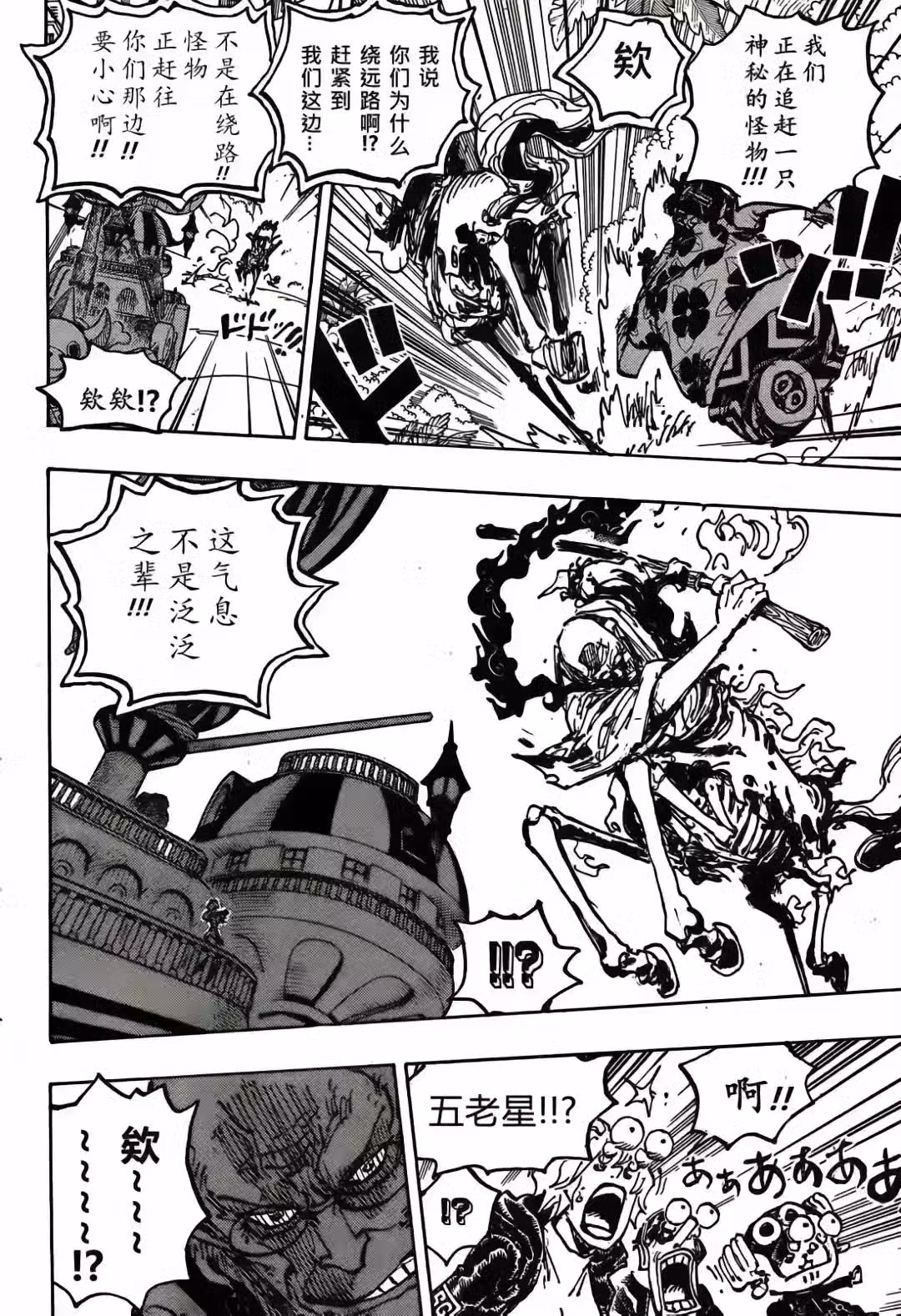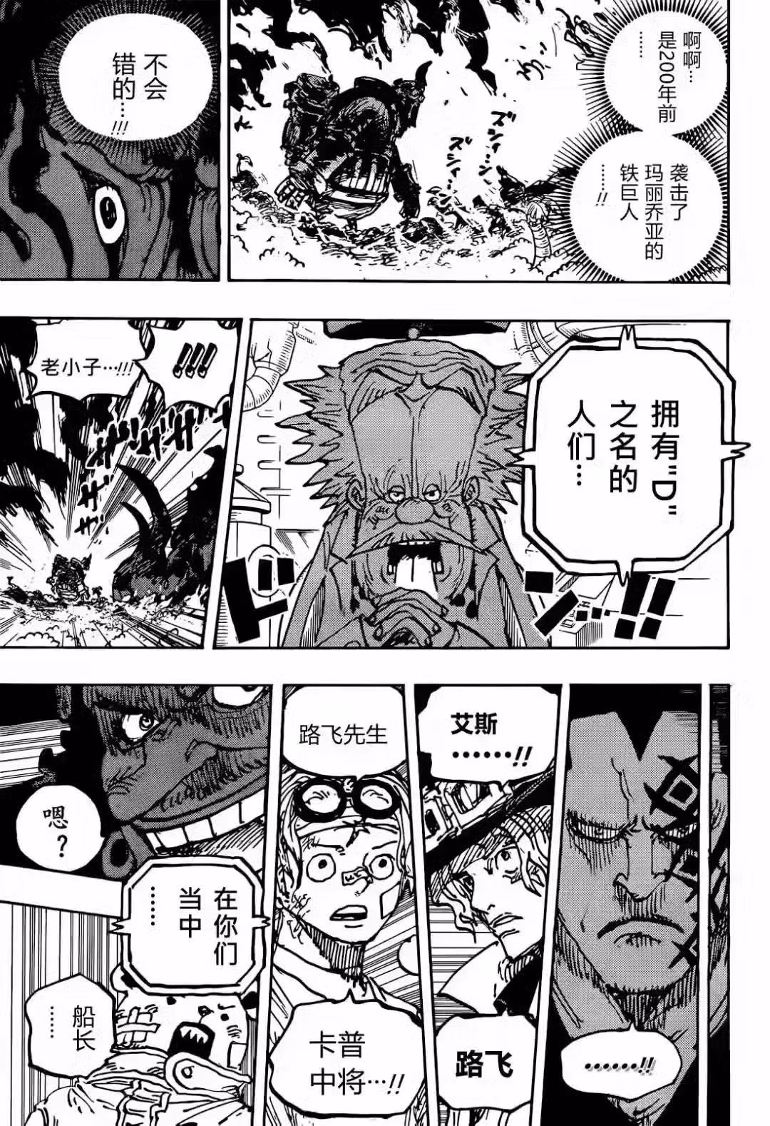 五老星開始攻擊古代機器人,他們擊飛了古代機器人,不過古代機器人並沒有停止運行,電話蟲好像被破壞,直播畫面被切斷,所有人都震驚了。貝加龐克剛想說你們當中,還可以說完這句話,畫面就消失了。