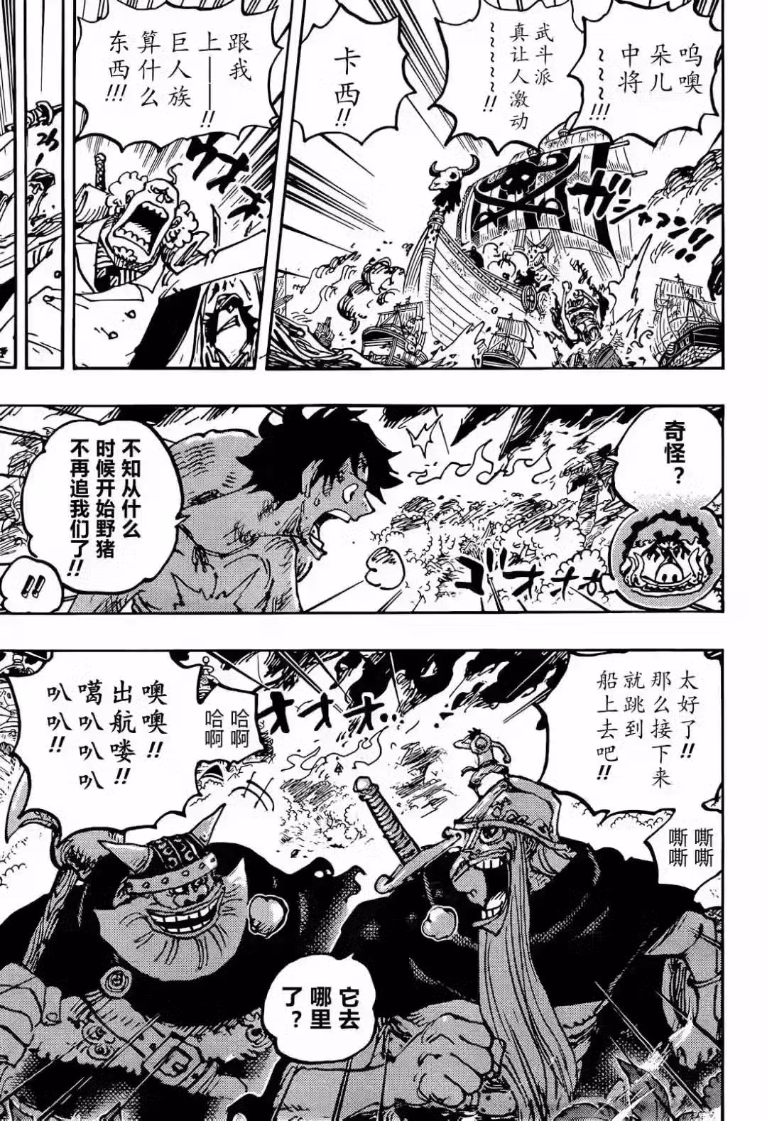 海軍中將開始反擊了,其中一位操控機械海獸的中將擊中了巨人族戰士,還擊中了船隻,多露中將也全力出擊,她一拳揍飛了巨人族。海軍也發動炮擊,打算擊沉巨人族的海賊船,東利和布洛基兩人正在逃跑,魯夫站在東利的頭上,他沒有看到水星。