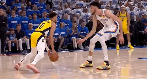 「步行者稱哈利伯頓是『小腿傷病』,卡萊爾說他『有些』不適,但是嘛...」Evan Jeffries的態度並不樂觀。 帶著這種傷病隱患,哈利伯頓表現不佳,他這一弱點也再次被雷霆抓住。 首節的雷霆保持著高強度的對抗,他們還是給哈利伯頓等步行者的持球人施壓,並且保持場上的身高優勢。