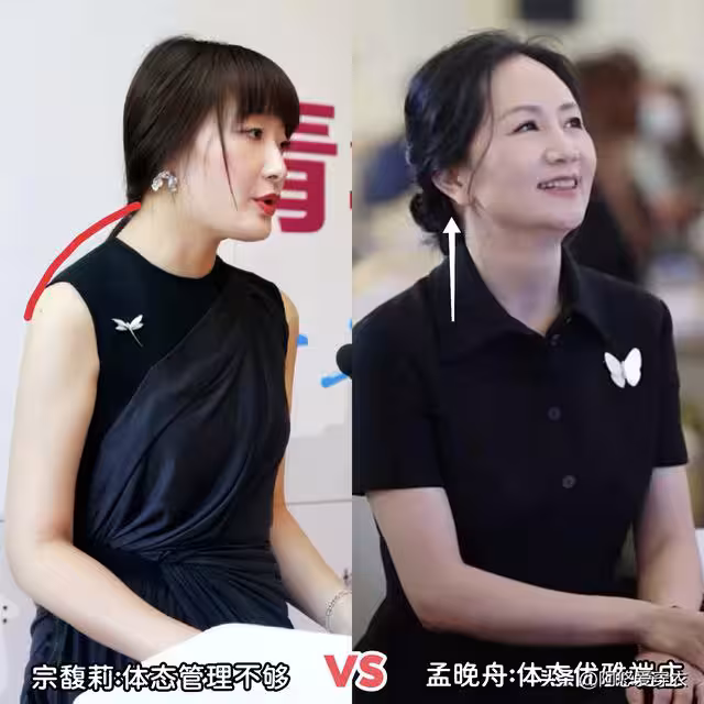 和我們普通人一樣,宗馥莉早期也沒那麼注重儀態,有明顯的脖子前傾、含胸駝背問題,不如孟晚舟端莊大氣。