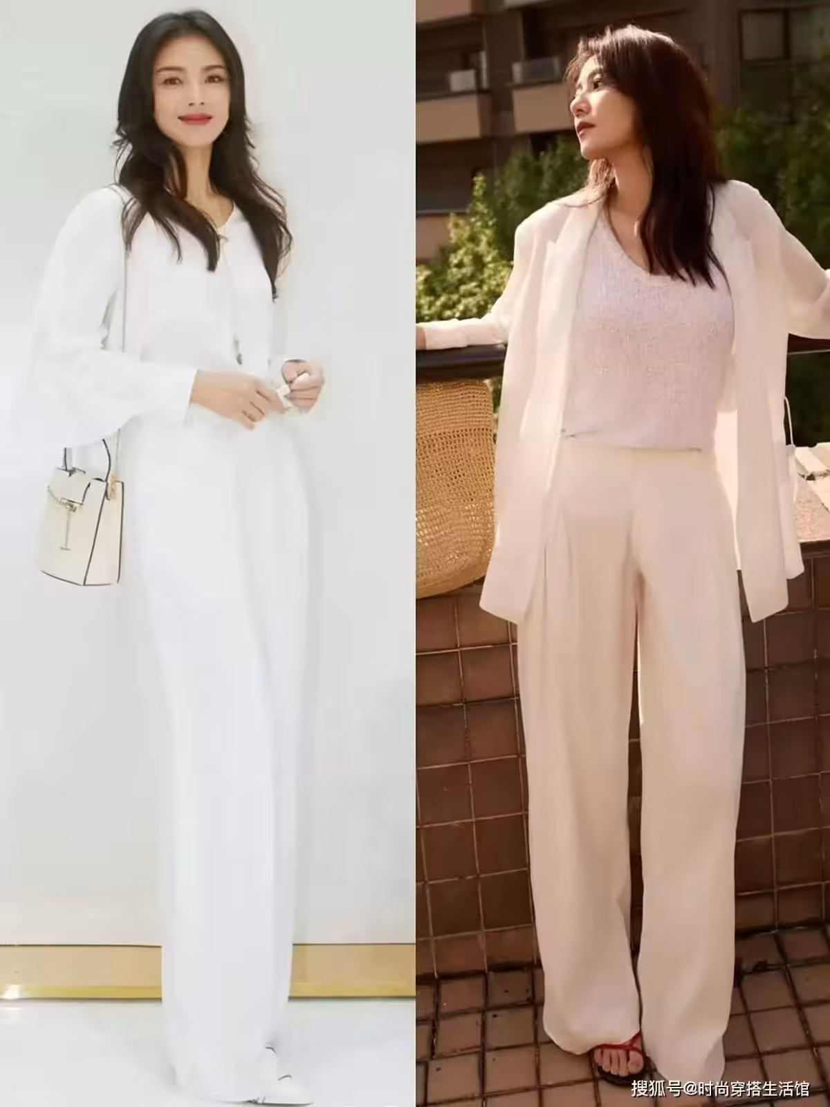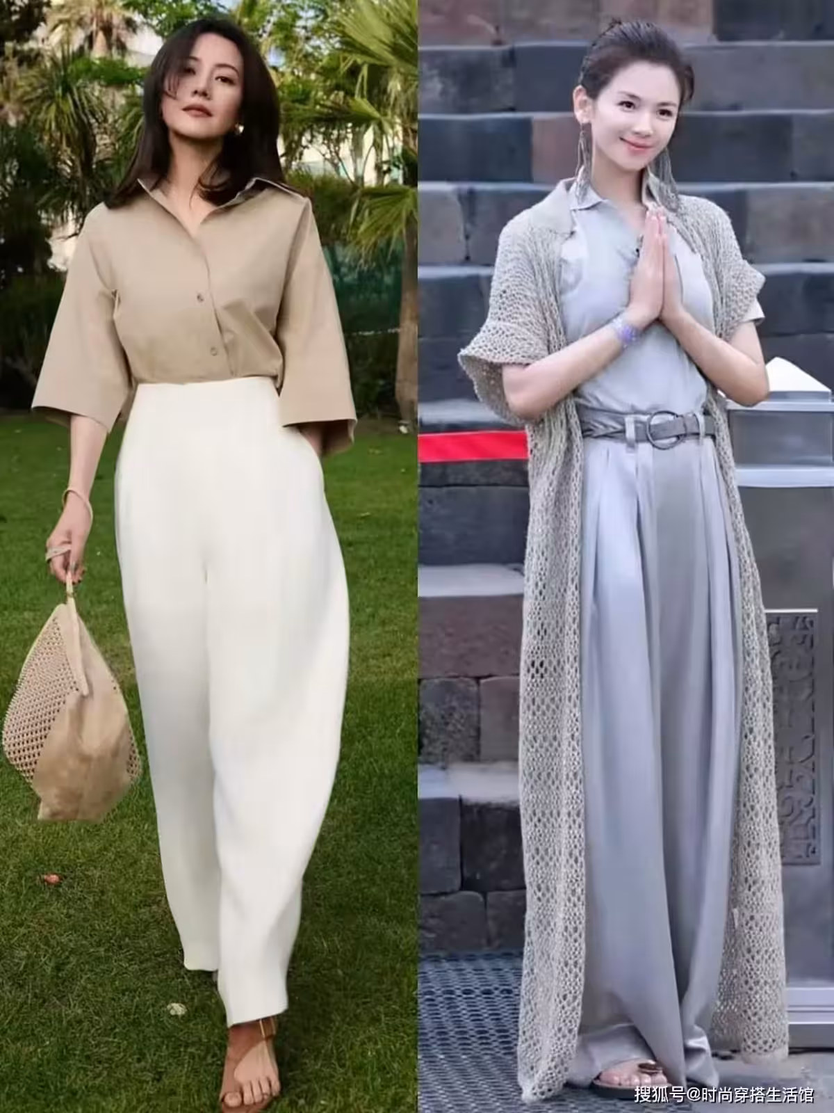 對於中年女性秋天穿闊腿褲非常注重腰線的選擇,畢竟穿同一條闊腿褲但是沒有塑造出高腰線的話就會讓我們的穿搭顯得五五分比例。我們可以看看劉濤、高圓圓的穿搭,她們選擇將上衣塞進闊腿褲,或者是選擇腰帶強調出腰線,瞬間就有效的拉長腿部線條,完全毫不費力就穿出高級感。