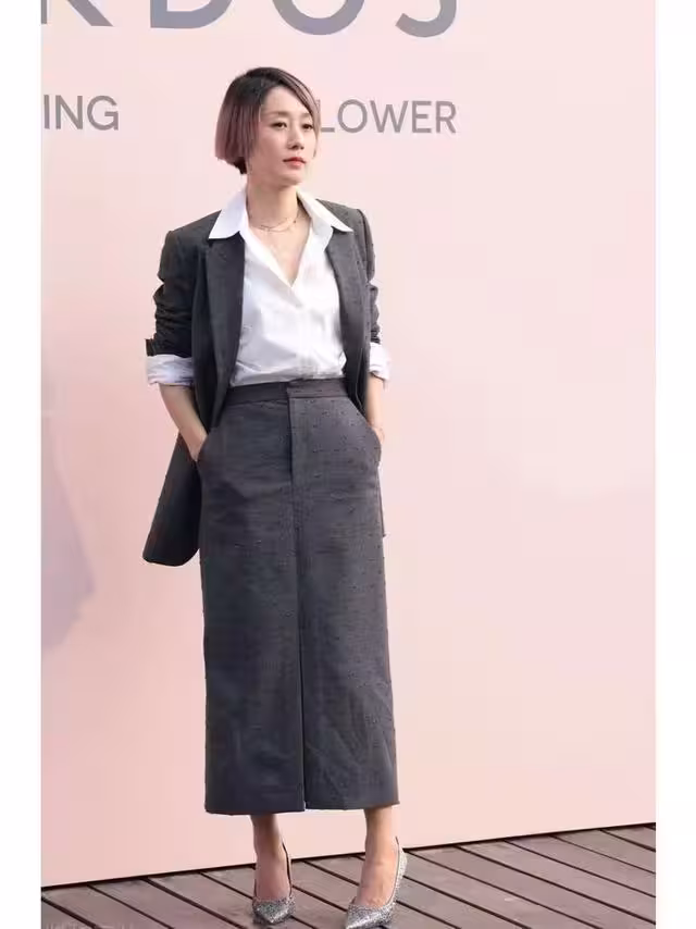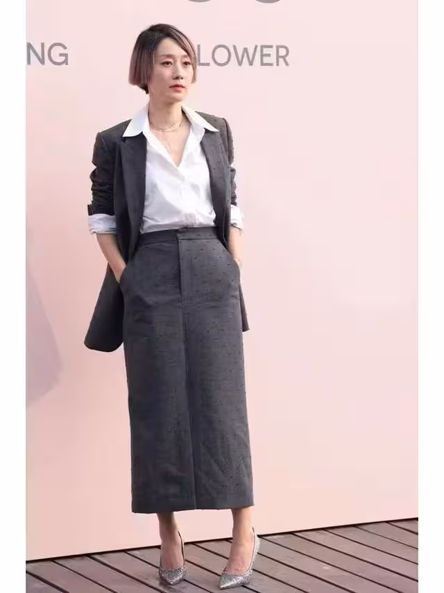 西裝外套與半身裙在面料、顏色上均一致,顏色為深灰色,顯得穿著者皮膚更白了。半身裙是直筒設計,鑒於裙擺松量相同,所以腿上肉肉再多也不擔心顯露。如果想讓身高在視覺上增長5cm,除了穿雙高跟鞋外,一款高腰半裙也是不錯選擇。針對鞋子,馬伊琍穿的是銀色高跟鞋,與灰色、白色搭配性都很強。
