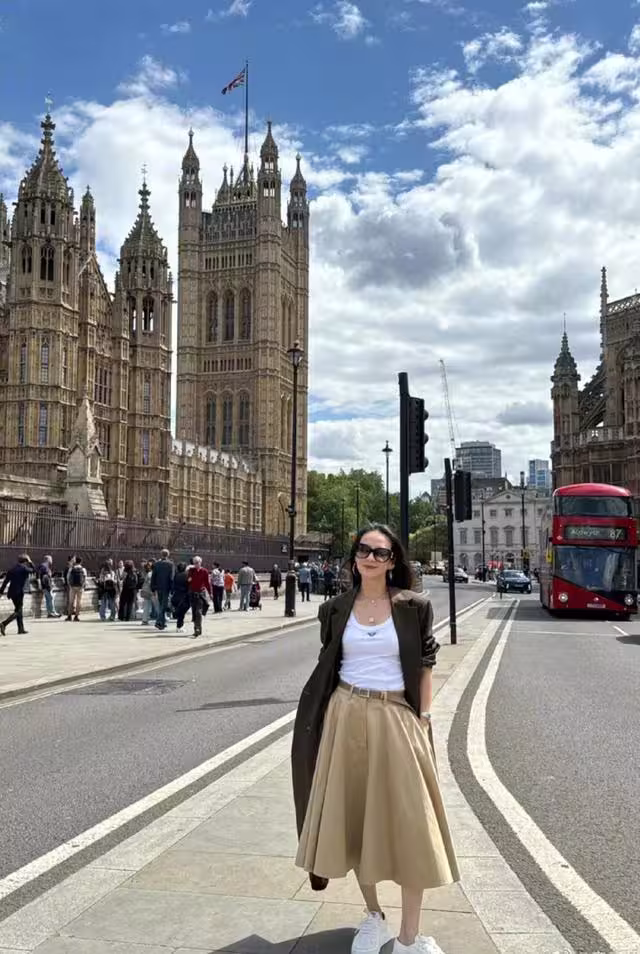 裙子腰間還配了一款皮帶,它的出現有優化身材比例的優點,同時與西裝外套的正式感相呼應。腳上是一雙無人不喜歡的小白鞋,其顏色與背心一致。白鞋對所穿季節不挑剔,關鍵是正式風、休閒風都能駕馭。