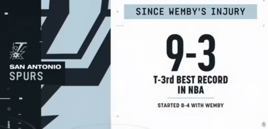 在文班亞馬缺席之後,馬刺拿到了9勝3負的戰績,排在全聯盟同期第3。